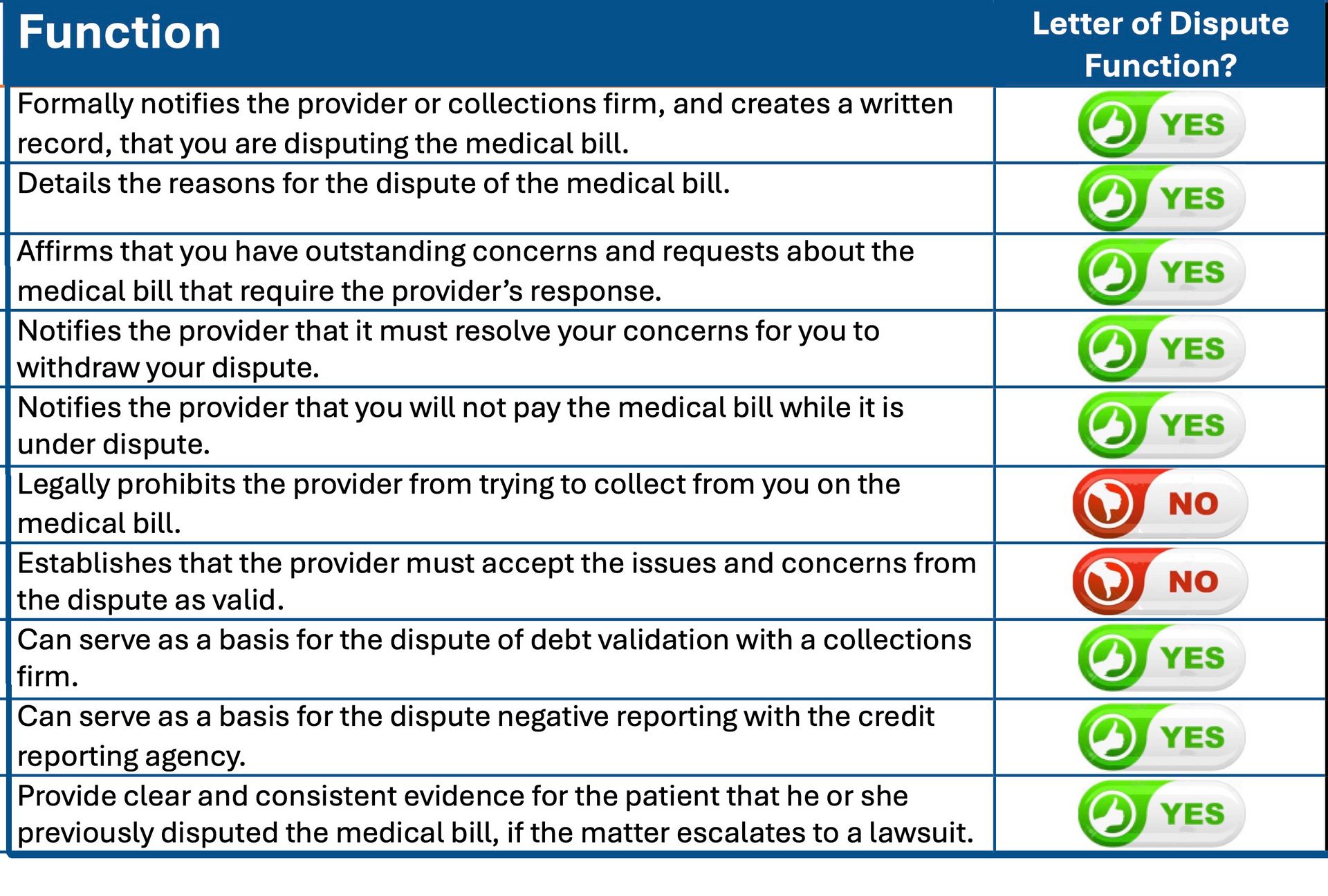 If a medical bill dispute escalates into a lawsuit, the Letter of Dispute can provide a clear and consistent evidence for the patient that he or she previously disputed the medical bill, the provider is at fault for its disregard for the Letter of Dispute and its concerns.