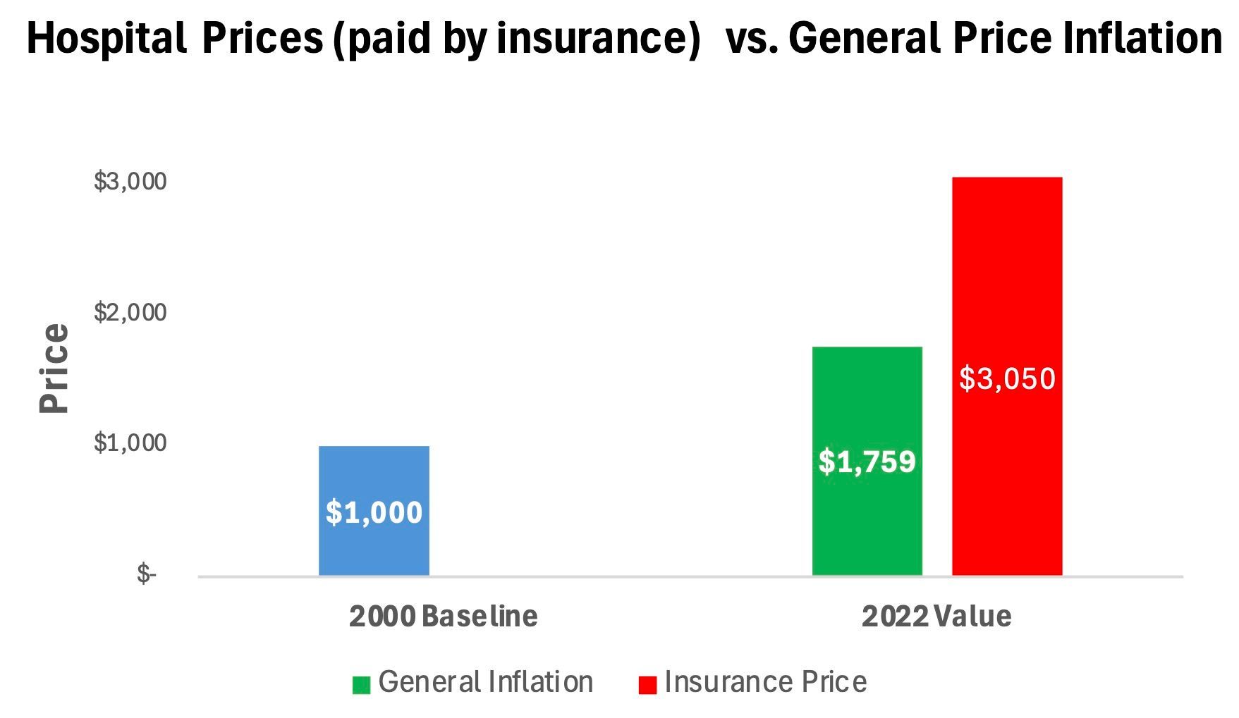 Most importantly, health insurance plans have failed at controlling Insurance Prices. Insurance Prices for hospital services increased nearly twice as rapidly as general inflation since 2000. This means that a hospital service with an Insurance Price of $1,000 in 2000 increased to over $3,000 in 2022, but would have increased to $1,759 under general inflation. Insurance Prices for physician and other services also outpaced general inflation, but to a lesser degree than for hospitals.