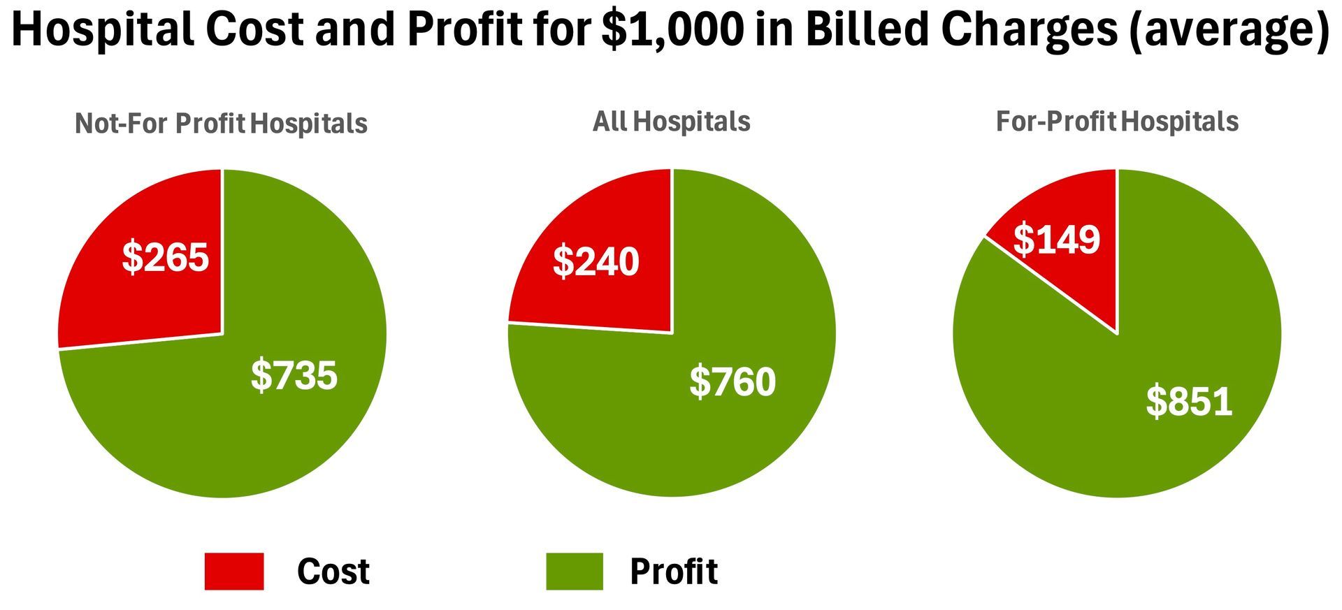 Just how high are these charge levels? Medicare requires hospitals to submit annual reports that track billed charges and costs to provide services. Using these reports submitted by hospitals themselves, the average ratio of hospitals’ costs to the hospitals’ billed charges for the service (“charge-to-cost ratio”) was 417% in 2018. Said differently, on average, hospitals charge over four times more than what it costs to provide services. For every $1,000 billed, $240 covers the cost to render the services and $760 is profit to the hospital. For-profit hospitals average a 671% charge-to-cost ratio. Nonprofit hospitals average 377%.
